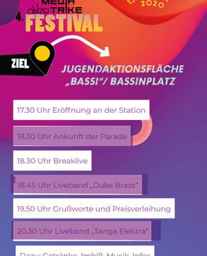 Nach einer Demonstration mit einem Lastenrad – und Fahrrad – Corso quer durch die Stadt mit dezentralen Veranstaltungen an 3 Lastenrad Ausleihstationen unserer flotte-potsdam.de feiern wir auf der Jugendaktionsfläche „Bassi“ wie gewohnt und beliebt unser Mediatrike – Festival für Lastenrad und Kultur mit HipHop und tanzbarer Livemusik junger lokaler Bands.